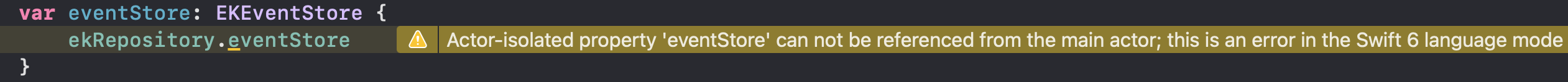 내 코드에서는 Actor 내부에 격리된 ekRepository의 eventStore 속성(property, 프로퍼티)을 Main Actor 맥락에서 접근하려고 했으며, Swift 6에서는 컴파일 오류로 나타난다. 문제가 발생한 부분의 코드만 요약하면 아래와 같다.